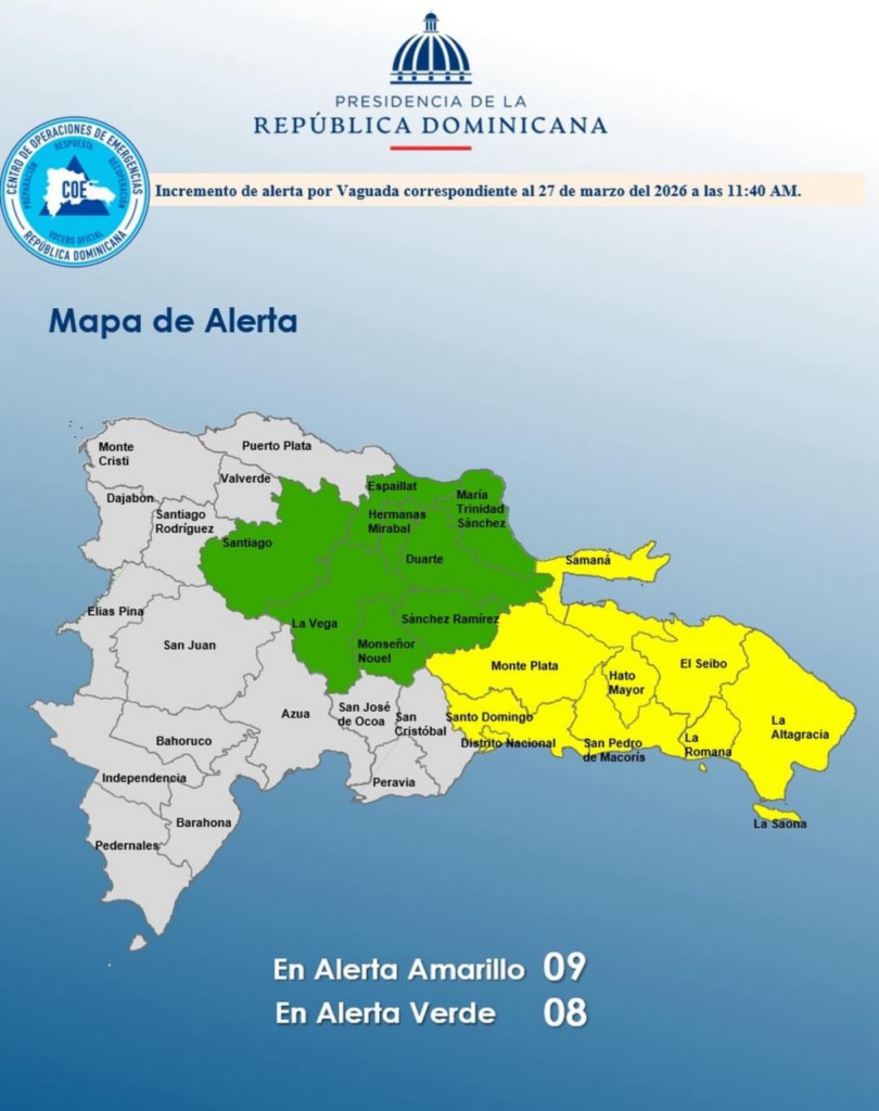 SANTO DOMINGO — El Centro de Operaciones de Emergencias (COE) emitió este jueves niveles de alerta para gran parte del territorio nacional debido a las intensas lluvias que afectan al país. El director del organismo, Juan Manuel Méndez García, hizo un llamado urgente a la prudencia, especialmente a los conductores, ante el incremento del riesgo de accidentes por la baja visibilidad y el pavimento mojado.
