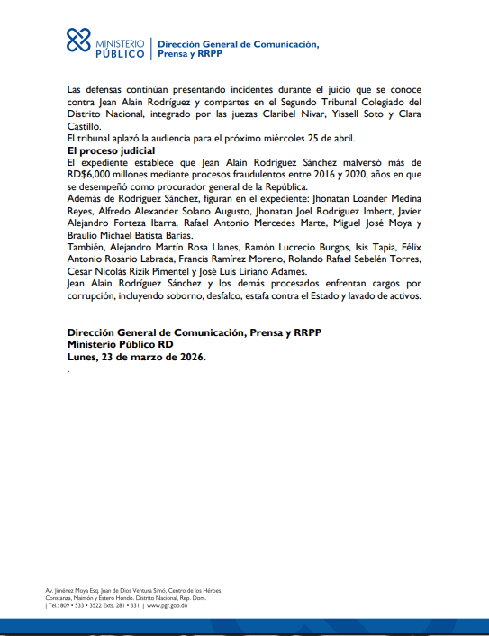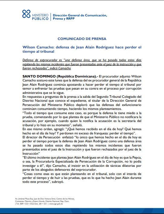 SANTO DOMINGO — El procurador adjunto y titular de la Pepca, Wilson Camacho, arremetió este lunes contra la estrategia legal de la defensa del exprocurador Jean Alain Rodríguez. Según Camacho, los abogados del exfuncionario apuestan a consumir el tiempo del tribunal para evitar enfrentar las pruebas de corrupción que pesan en su contra. A la salida del Segundo Tribunal Colegiado del Distrito Nacional, Camacho calificó la estrategia como una "defensa aérea" que se limita a repetir incidentes procesales que ya fueron rechazados anteriormente en la etapa de instrucción. "Miedo a las pruebas" El magistrado Camacho fue enfático al señalar que el retraso en el proceso no es responsabilidad del Ministerio Público, sino de la parte defensora. "Todo el tiempo que consume este caso es porque la defensa le tiene miedo a la prueba", afirmó, desmintiendo alegatos sobre falta de notificación de la acusación. Incidentes repetitivos: Camacho denunció que la defensa ha pasado días reiterando planteamientos ya fallados. Cuestionamiento de autoridad: El último incidente planteado por Rodríguez sugiere que la Pepca no tenía facultad para investigarlo, argumento que el Ministerio Público tilda de táctica para huir al juicio de fondo. Próxima audiencia: El tribunal, integrado por las juezas Claribel Nivar, Yissell Soto y Clara Castillo, aplazó el conocimiento del juicio para el próximo miércoles 25 de abril. "¿Qué hemos hecho en el día de hoy? Y perdonen mi exceso de franqueza: perder el tiempo. La defensa solo tiene el interés de huir a las pruebas." — Wilson Camacho, Titular de la Pepca. Detalles del expediente Medusa El proceso judicial contra Jean Alain Rodríguez y otros 14 imputados se centra en una presunta red de corrupción que operó entre 2016 y 2020. Los puntos clave del caso son: Monto malversado: Se estima una malversación de más de RD$6,000 millones mediante procesos fraudulentos. Cargos principales: Soborno, desfalco, estafa contra el Estado y lavado de activos. Coimputados clave: Entre los procesados figuran Jhonatan Medina Reyes, Alfredo Solano Augusto, Jhonatan Rodríguez Imbert y Javier Forteza Ibarra, entre otros exfuncionarios y empresarios. La acusación sostiene que la estructura criminal utilizó la Procuraduría General de la República como una plataforma para el enriquecimiento ilícito y el financiamiento de actividades políticas personales. Dirección General de Comunicación, Prensa y RRPP, Ministerio Público RD. Navegación de entradas CONDENAS MÁXIMAS POR HOMICIDIO Y ASALTO EN LOS ALCARRIZOS Y HATO MAYOR Ricardo Nieves reacciona a la renuncia de Pedro Martínez, señalado como presunto cabecilla de corrupción en Medio Ambiente