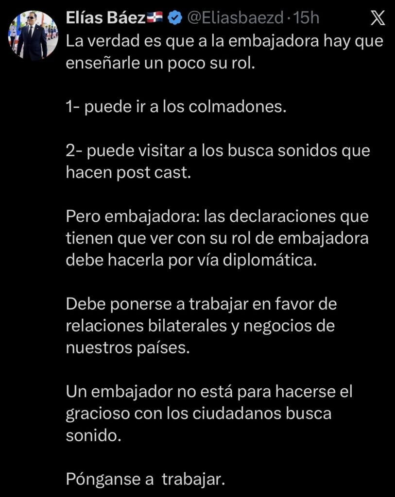 A través de redes sociales, Elías Báez cuestionó el rol de la diplomática, señalando que sus declaraciones deben realizarse “por vía diplomática” y no en espacios públicos, además de sugerir cuáles deberían ser sus prioridades como embajadora.